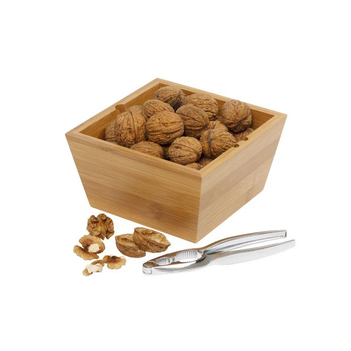 Pähkinäkulho pähkinänsärkijällä. Kulho on kaunista bambua ja särkijä terästä. Koko 15,5 x 15,5 x 8,4 cm. Lahjakotelo.