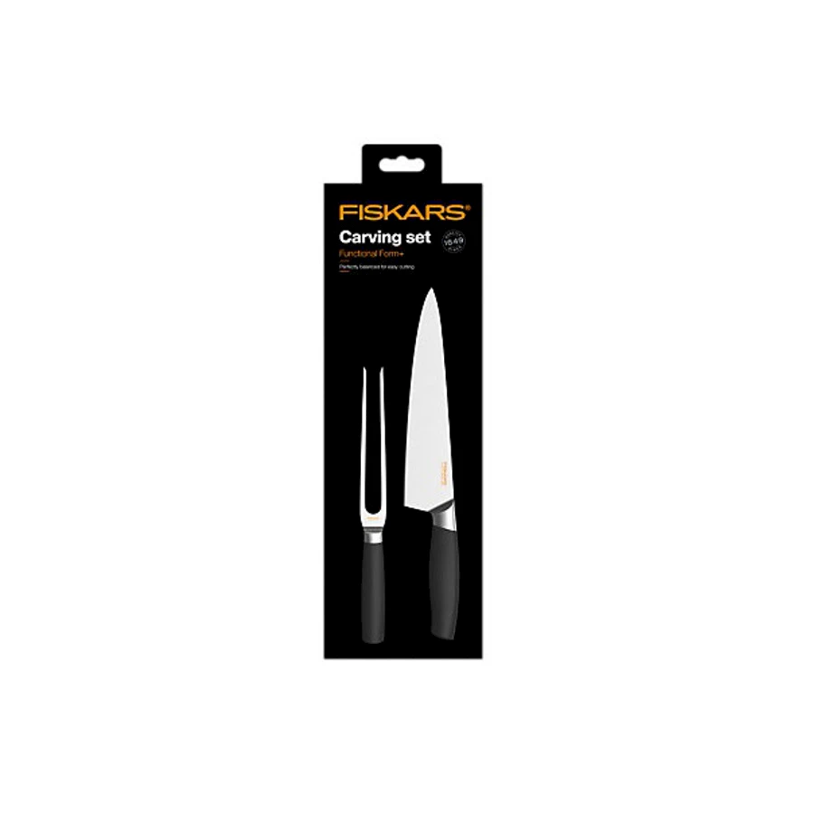 Fiskarsin laadukas paistisetti. Setti sisältää tärkeimmät välineet lihan leikkaamiseen: ison kokinveitsen 19 cm sekä paistihaarukan. Täydellisesti tasapainotettu veitsi tarkkaan ja helppoon leikkaamiseen. Paistihaarukka toimii apuna paistin tai kinkun leikkaamisessa. Korkealaatuista ruostumatonta terästä.