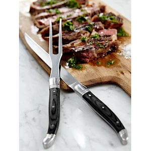 Tyylikäs paistiveitsi ja-haarukkasetti. Pakkauksen koko 30,5x8,5x2,8 cm. Pakattu lahjalaatikkoon.