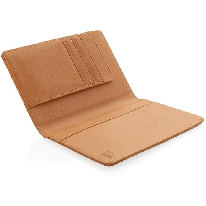 Eco RFID Passikotelo Eco on valmistettu luonnollisesta korkista ja siinä on RFID-suojus, joka suojaa henkilöllisyysvarkauksilta ja sähköisiltä taskuvarkauksilta. Passikotelossa on 3 kätevää korttipaikkaa sekä setelilokero. Ympäristöystävällinen ja vegaaninen lahja johon voidaan merkata yrityksesi logo tai mainosviesti. Lahjapakkaus. Pyydä tarjous.