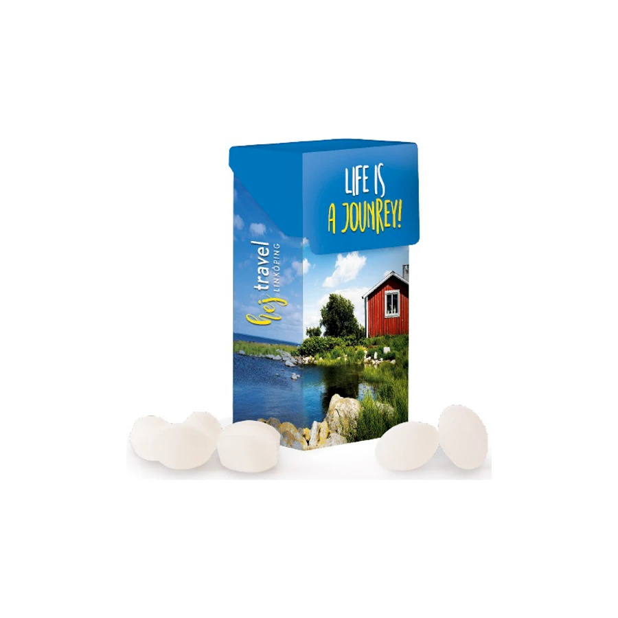 Pieni pastillirasia näyttävällä neliväripainatuksella. Pahvisessa karkkiaskissa on sisällä vegaaneille sopivia raikkaita minttupastilleja tai hedelmäkarkkeja valintasi mukaan. Yrityksesi logolla ja brändisi mukaisella kuvalla painettu makeisrasia on loistava tuote messuille ja asiakastapahtumiin. Säilyvyys (36 kk). Pakattu yksittäin läpinäkyvään suojapaperiin.