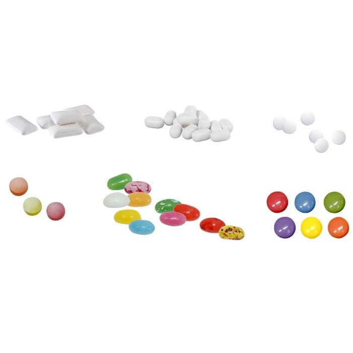 Sisältövaihtoehdot: Tic Tac -piparminttupastillit, suklaarakeet, sokerittomat piparminttupastillit, sokeriton purukumi, suklaarakeet, jelly bean hedelmämakeiset, hedelmäkarkit. Vegan.