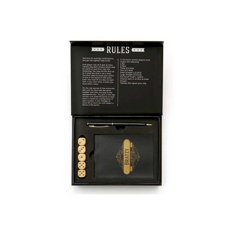 Ylellinen Bratzy peli kullanvärisillä arpakuutioilla. Tyylikäs Peli Bratzy on viritetty versio klassisesta Yatzy pelistä, jossa kullanväriset arpakuutiot, muistivihko sekä kynä. Ohjevihkossa peliohjeet suomeksi ja englanniksi. Pakattu lahjalaatikkoon. Koko 18 x 14 x 3 cm.