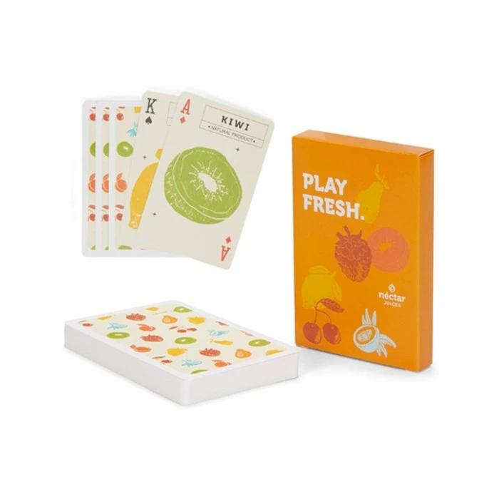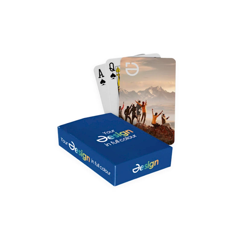 Pelikortit omalla aineistolla. Yrityksesi brändin mukaiset painetut pelikortit ovat klassinen valinta, joka tuo iloa kaikenikäisille. Kortit sopivat pokeri-iltaan, perhepelihetkeen tai yksin pelaamiseen. Pakka sisältää 52/54 korttia. Kortit ovat kustomoitavissa asiakkaan toiveiden mukaan. Painatus voidaan tehdä yhdelle tai molemmille puolille korttia. Kustomoidut pelikortit pakataan sellofaaniin ja kustomoituun pakkaukseen. Saatavana myös muita vaihtoehtoja. Pyydä tarjous omasta toteutuksesta.