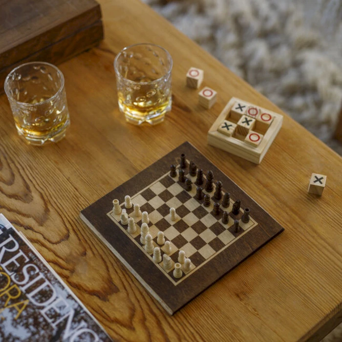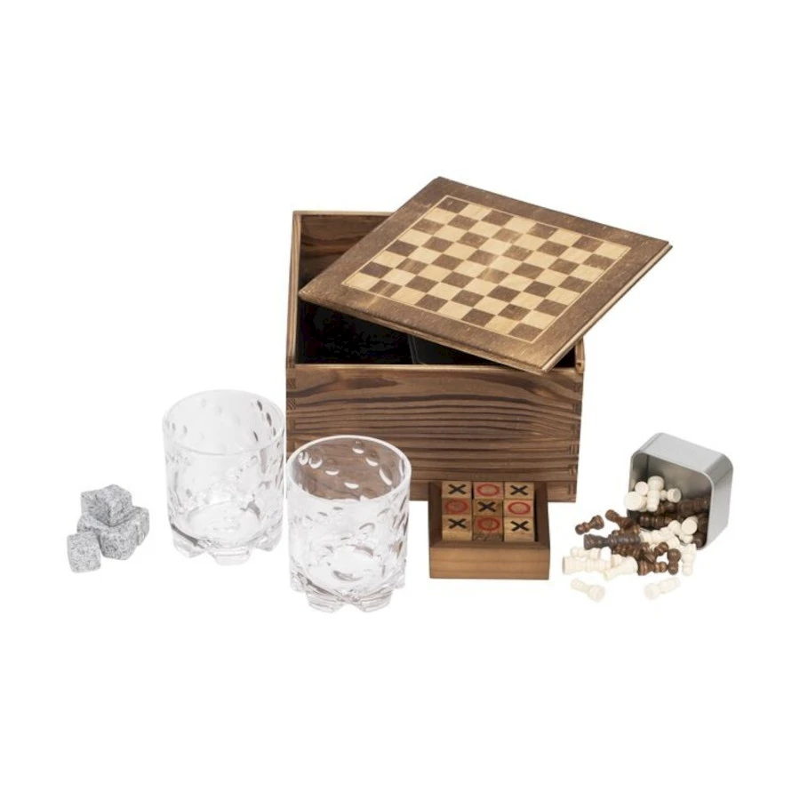 Klassinen pelisetti koko perheelle. Shakki ja ristinolla samassa paketissa – mukana myös kaksi pyöritettävää juomlasia. Helppo ottaa mukaan ja hauska pelata missä tahansa. Mukana myös viilennyskuutiot juomia varten. Pakkaus: lahjalaatikko