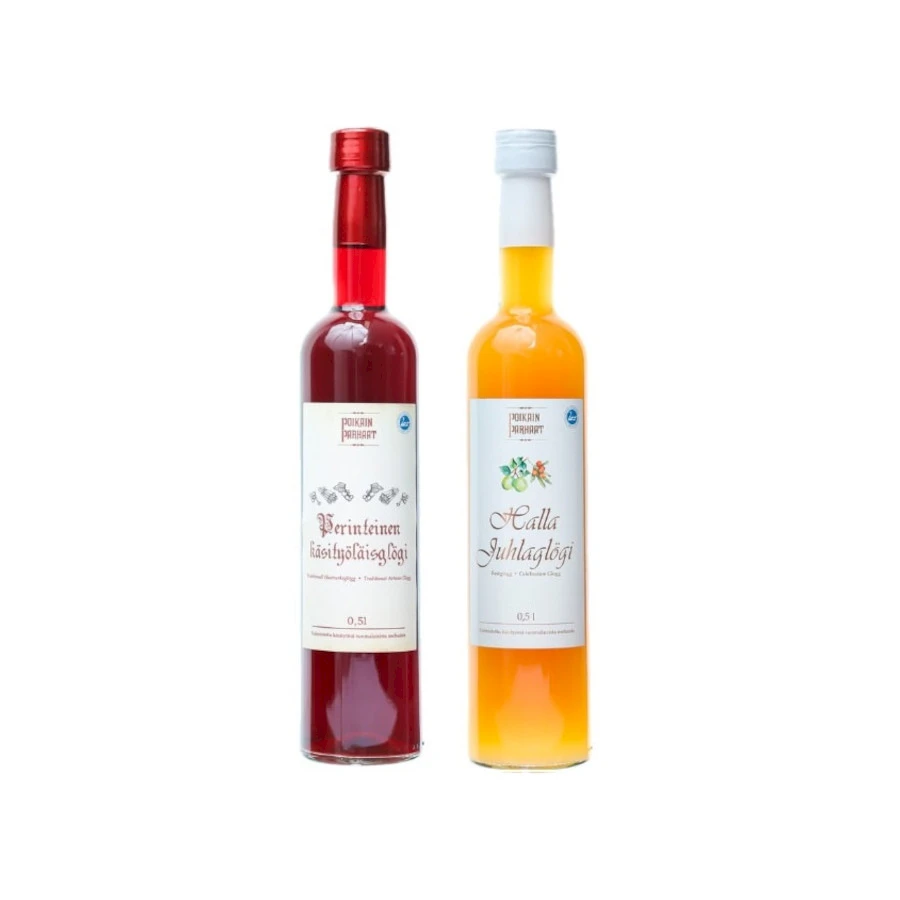 Perinteinen käsityöläisglögi tai vaaleaglögi omalla etiketillä. Suomalaiseen mustaherukkatäysmehuun tai tyrni-omenamehuun valmistetut 0,5 L aidot glögit, joissa maistuvat perinteiset glögimausteet. Ei sisällä teollisia maku- tai väriaineita. Laktoositon,gluteeniton, vegaaninen.