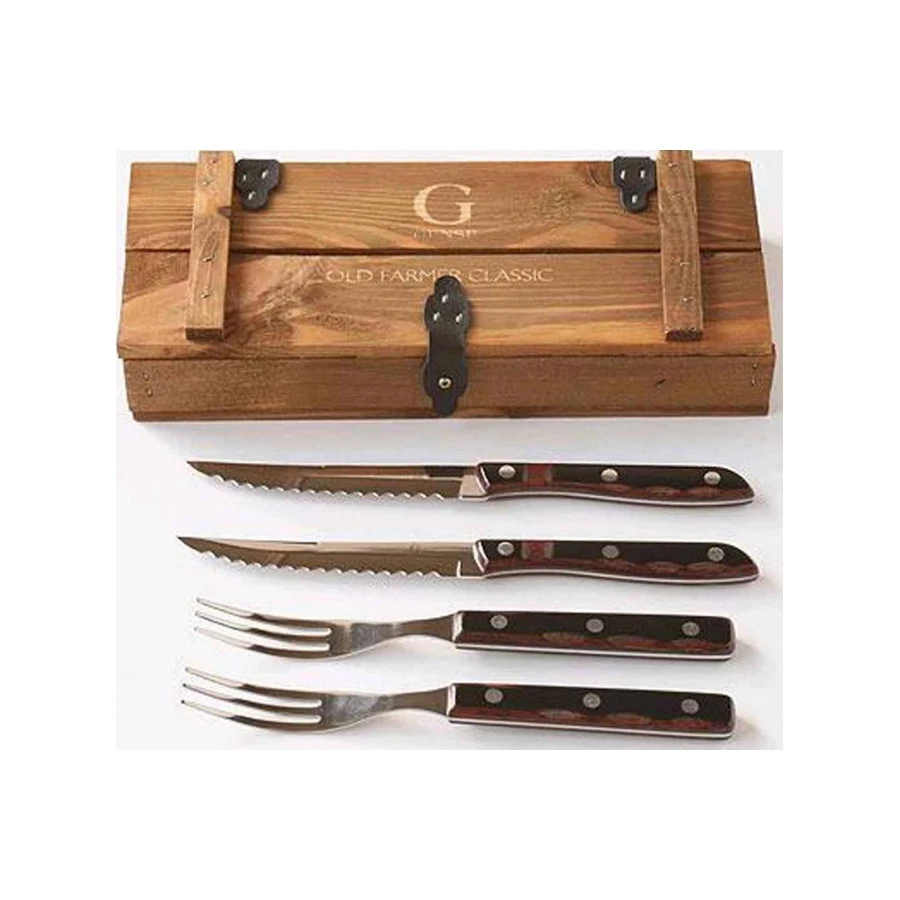 Old Farmer Classic pihviaterin setti puisessa lahjakotelossa. Tanskalainen muotoilija ja arkkitehti Bent Severin on muotoillut suositun ja korkealaatuisen Old Farmer sarjan, joka on valmistettu ruusupuusta ja korkeakiilloitetusta ruostumattomasta teräksestä. Setti sisältää kaksi haarukkaa ja kaksi veistä.