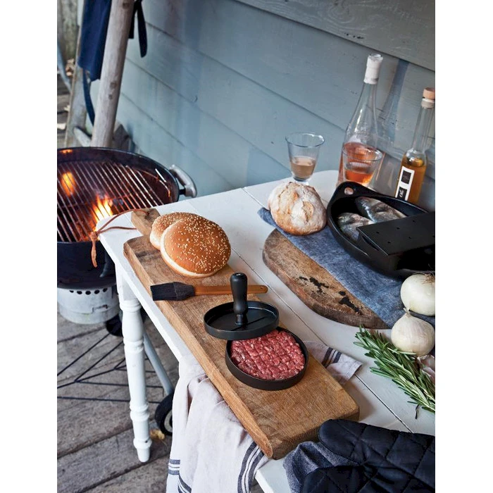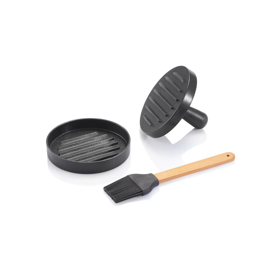 Pihviprässi ja suti samassa grillauspaketissa. Pihviprässin avulla voit muotoilla hienoja ja tasalaatuisia jauheliha- ja hampurilaispihvejä. Grillaaminen helpottuu kun kaikki pihvit ovat yhtä suuria ja niiden valmistamiseen menee yhtä kauan aikaa. Suti ja pihvipuristin on pakattu kapeaan pahvikoteloon. Pyydä tarjous omasta määrästä ja logomerkkauksesta.