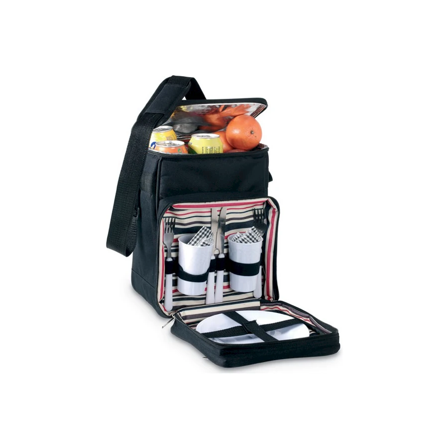 Piknik laukku jossa iso kylmäosasto eväille ja edessä tasku aterimille. Laukussa on säädettävä olkahihna ja kolme vetoketjullista taskua. Piknik kylmälaukku sisältää 2 mukia, 2 lautasta, 2 paria veitsiä ja haarukoita ja kaksi servettiä. Laukku on 600D polyesteriä ja sisäpuolella PEVA-materiaalia. Saat laukun etupuolen taskuun yrityksesi logopainatuksen.
