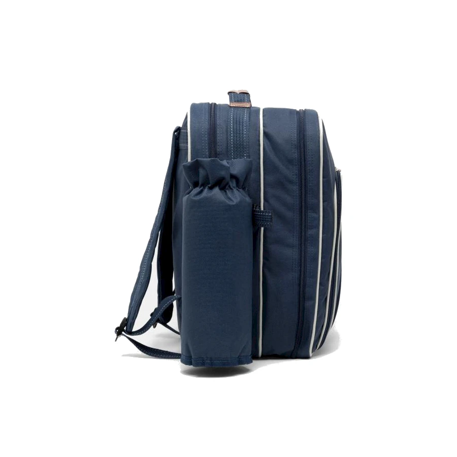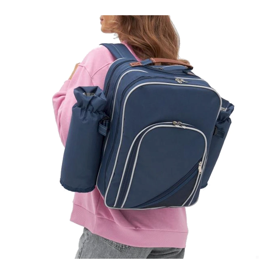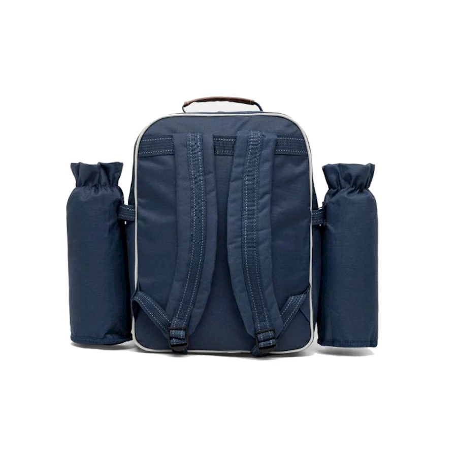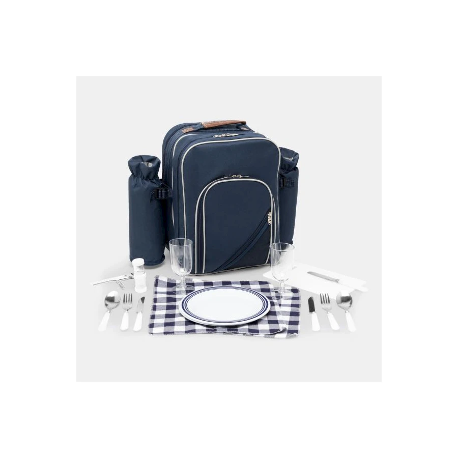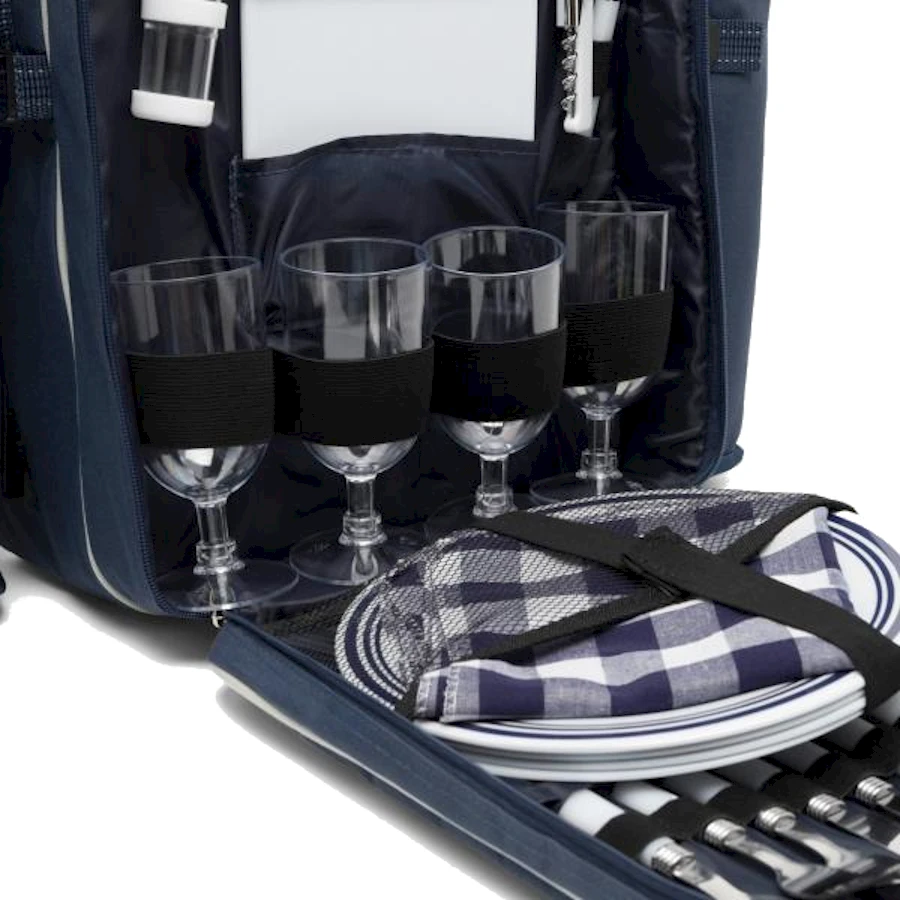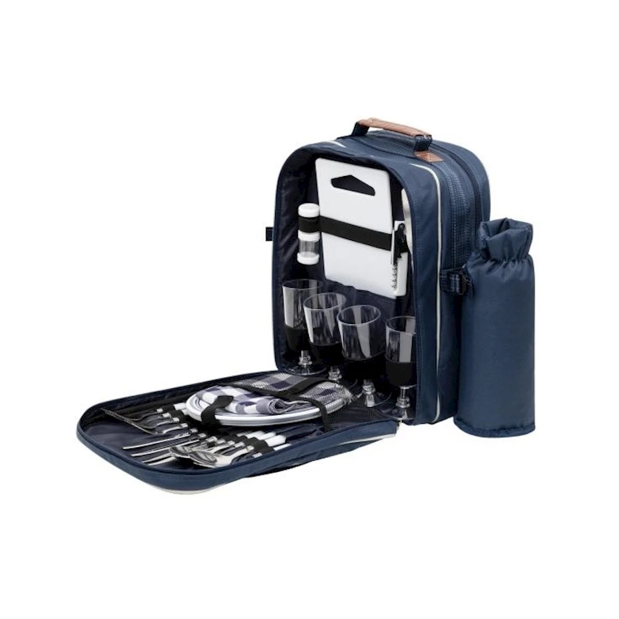 Piknik-reppu 4 hengelle. Repussa sisäämrakennettu kylmälaukku. Repun etutaskusta löytyy ruokailuvälineet, muoviastiat ja viinilasit sekä juustoveitsi, tarjoilijan veitsi, kangaslautasliinat, suola- ja pippurimylly ja leikkuulauta.