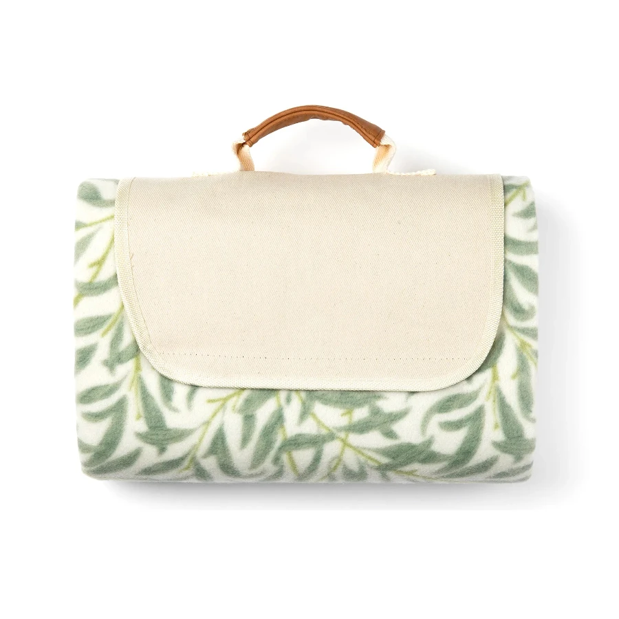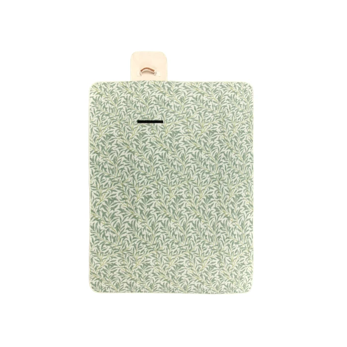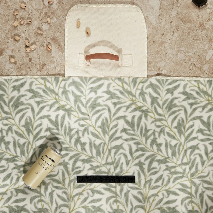 Willow Bough RPET piknikhuopa. Pehmeästä fleecestä valmistettu huoliteltu piknikhuopa, jossa on purjekankaisia ja keinonahkaisia somisteita. Kaunis kuosina on William Morrisin tunnettu Willow Bough. Päällysmateriaali on kokonaan peräisin kierrätetyistä PET-pulloista. Pohja on valmistettu niin kutsutusta PEVAsta, joka torjuu kosteutta. Kätevän rakenteensa ansiosta huopa on helppo taitella kokoon ja ottaa mukaan.