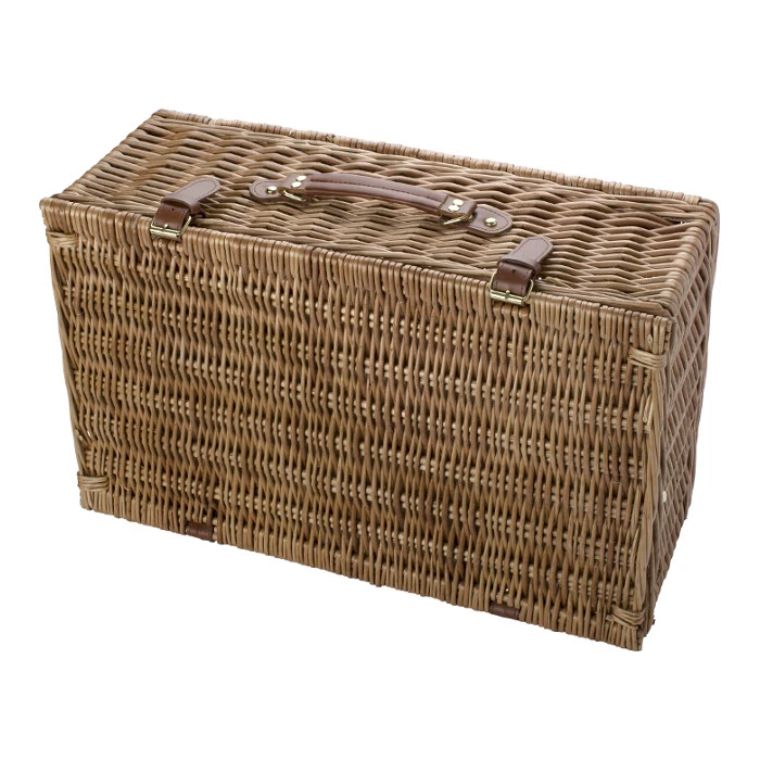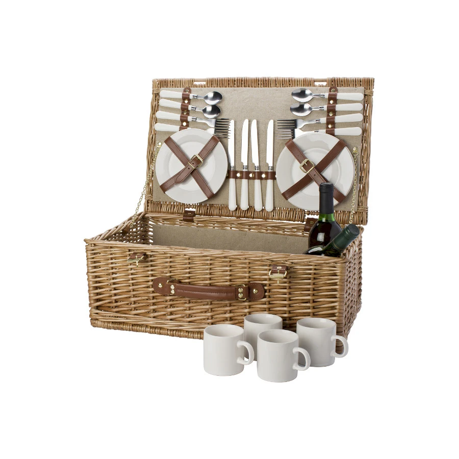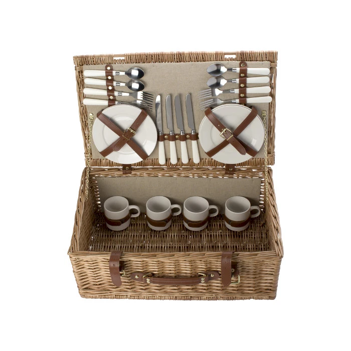 Piknikkori, jossa aterimet ruostumattomasta teräksestä, neljä keraamista mukia ja keraamista lautasta. Mukin vetoisuus 0,21 ml.