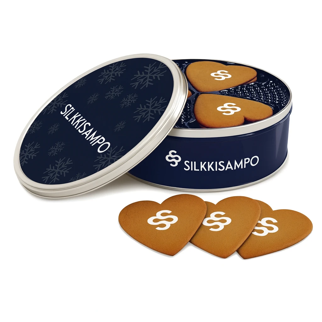 Herkulliset logopiparkakut brändätyssä peltipurkissa. Ihastuta toimistoväki joulun tuoksulla ja rapeilla logopipareilla. Logo voidaan lisätä pipareihin sokerikuorrutteella, ja myös tyylikäs peltipurkki voidaan brändätä halutulla tavalla. Piparit ovat 100 % vegaaneja ja palmuöljyttömiä.