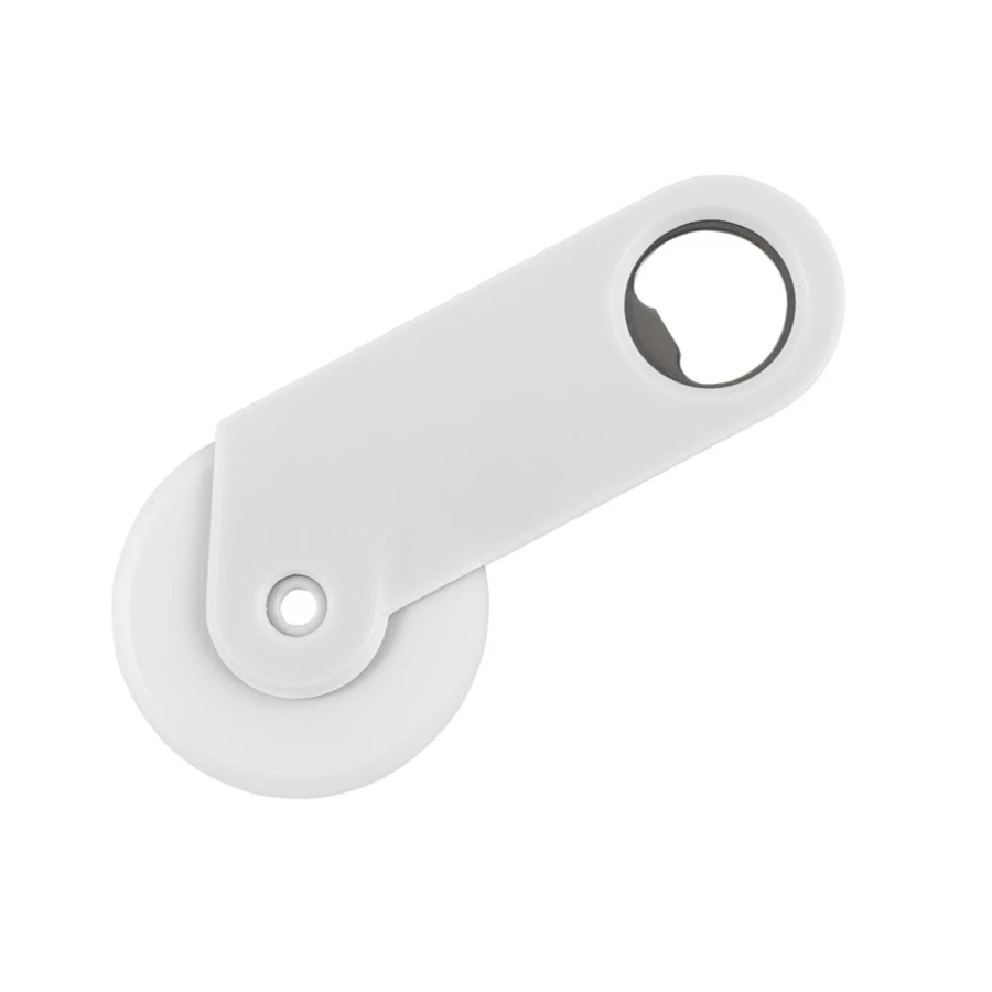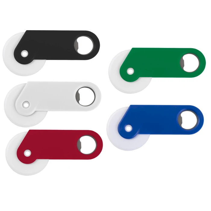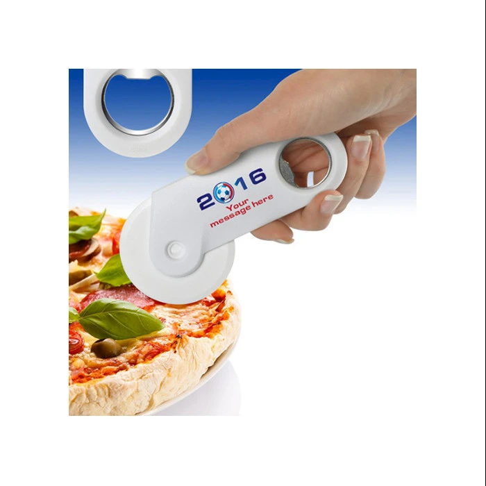 Pizzaleikkuri ja pullonavaaja samassa. Erinomainen jakolahja messuille, massatapahtumiin ja urheilutapahtumiin. Tuote sisältää sekä pizzaleikkurin että pullonavaajan.