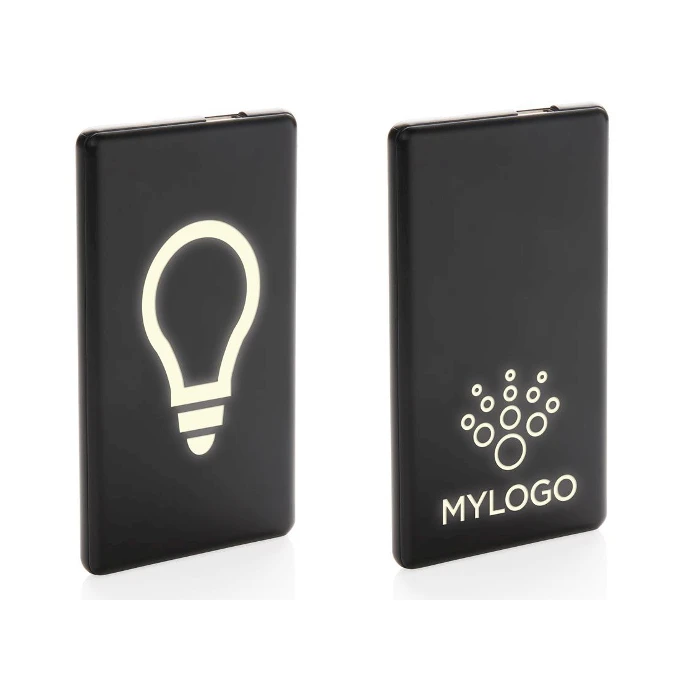 Loistava PowerBank Light up vara-akku valologolla. PowerBankkiin kaiverrettu yrityksesi logo tai teksi loistaa upeasti valoa aina vara-akkua ladatessa. Kestävässä Power Bankissa on 4 000 mAh latauskapasiteetti. Power Bank Light Up on ohut ja laadukas varavirtalähde jossa on litium-polymeri-akku. Output: 5V/2.1A. Input: 5V/1.5A. CE-hyväksytty. Powerbank logolla on erinomainen mainostuote.