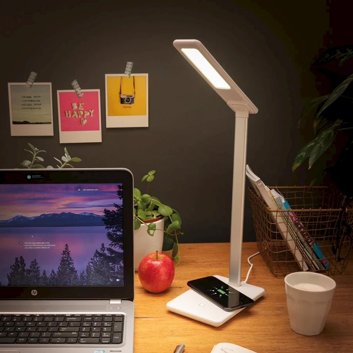 Pöytälamppu LED-valolla ja langattomalla laturilla päivittää työpöytäsi seuraavalle tasolle. Lataa puhelimesi langattomasti asettamalla se lampun alustalle. Lampussa on myös USB-portti tavallista latausta varten kaapelilla. Valon voi sytyttää lampun kosketuspainikkeella. Lampun käyttöaika on enintään 50 000 tuntia. Sisältää 150 cm:n micro-johdon. Yhteensopiva kaikkien QI-laitteiden kanssa, kuten uusimman Android-sukupolven laitteiden sekä iPhone 8:n ja sitä uudempien kanssa. Tuloteho: 5V / 2A. USB-lähtö: 5 V / 1 A Langaton lähtö: 5 V / 1 A, 5 W. Väri : valkoinenMateriaali: ABSKoko: 38,6 x 12 x 25 cm