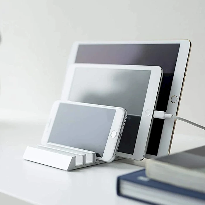 Puhelinteline/Tablettiteline Tower. Telineeseen mahtuu kuusi laitetta. Alumiinisessa telineessä silikoniset reunat, jotka eivät naarmuta laitetta ja pitävät laitteet hyvin paikallaan telineessä.