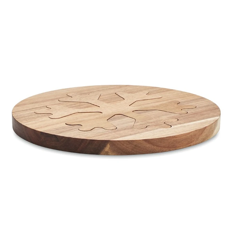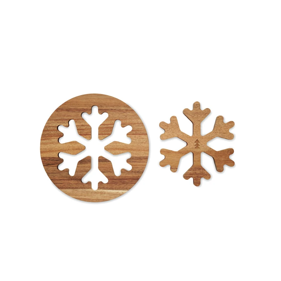 Puiset pannunaluset helposti postitettavassa lahjapakkauksessa. Puiset pannunaluset voit asetella vierekkäin kahdelle kattilalle tai asetella ne sisäkkäin. Alusessa on kaunis lumihiutalekuvio. Halkaisija noin 22 cm ja paksuus 1,5 cm. Yrityksesi logomerkkaus on mahdollista painaa pannunaluseen.