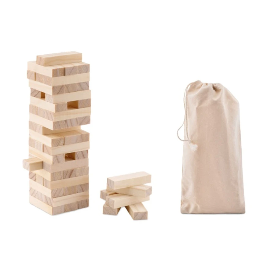 Katso, kuinka korkealle voit pinota puiset palikat ennen kuin torni kaatuu tämän hauskan kaatuvan torni pelin parissa. Sisältää 54 palikkaa, jotka on helppo laittaa takaisin puuvillapussiin. Logomerkkaus puuvillapussiin.