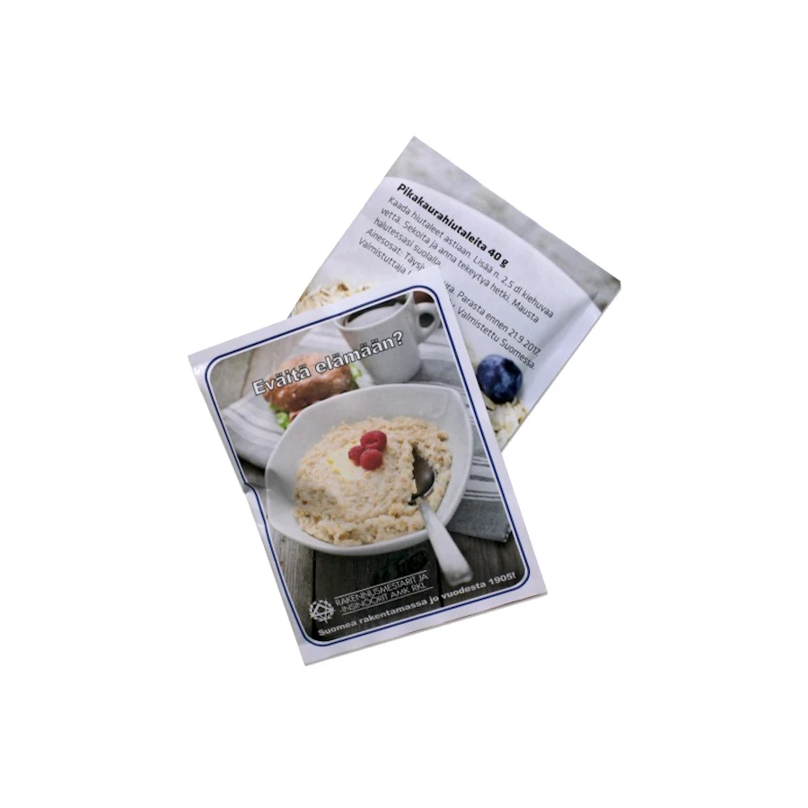 Puuropussi omalla painatuksella. Pussin sisällä kotimaisia pikakaurahiutaleita 40 g. Anna terveellinen lahja joka lämmittää ja maistuu. Pussin sisällöstä valmistat hetkessä lautasellisen ravitsevaa täysjyväkaurapuuroa. Lisää vain kuuma vesi ja puuro on valmis. Saat monivärisen maiospainatuksen pussiin. Minimi tilausmäärä 100 kpl.