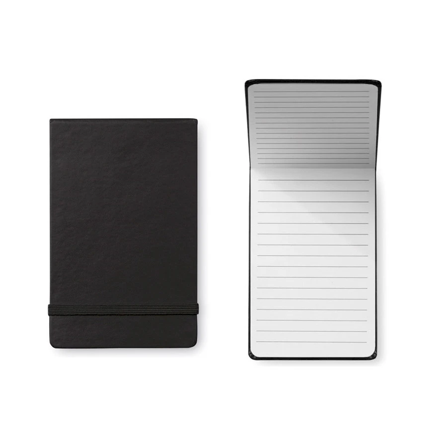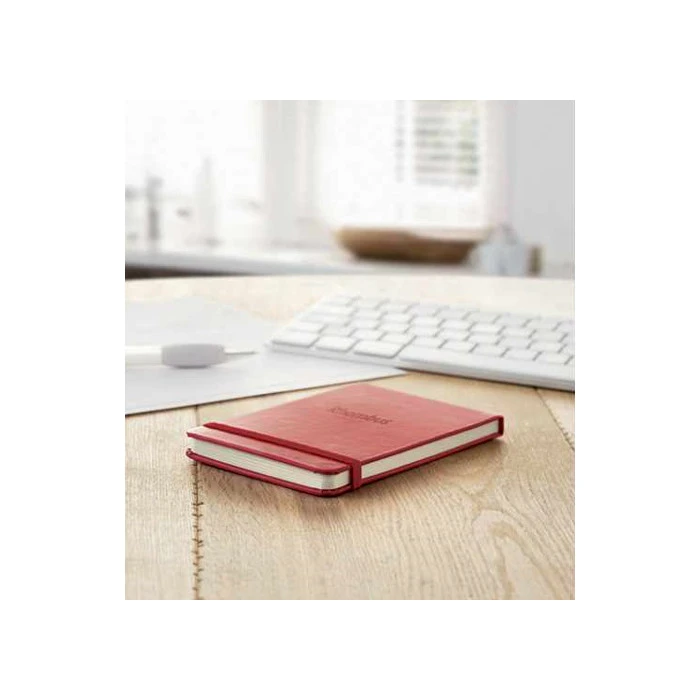 Kovakantinen, pystymallinen muistikirja. Muistikirjassa on kierrätyspaperista valmistetut viivoitetut sivut. Vihkon sisällä 80 sivua. Paperi 70 gr. Muistion voi sulkea kuminauhalla.