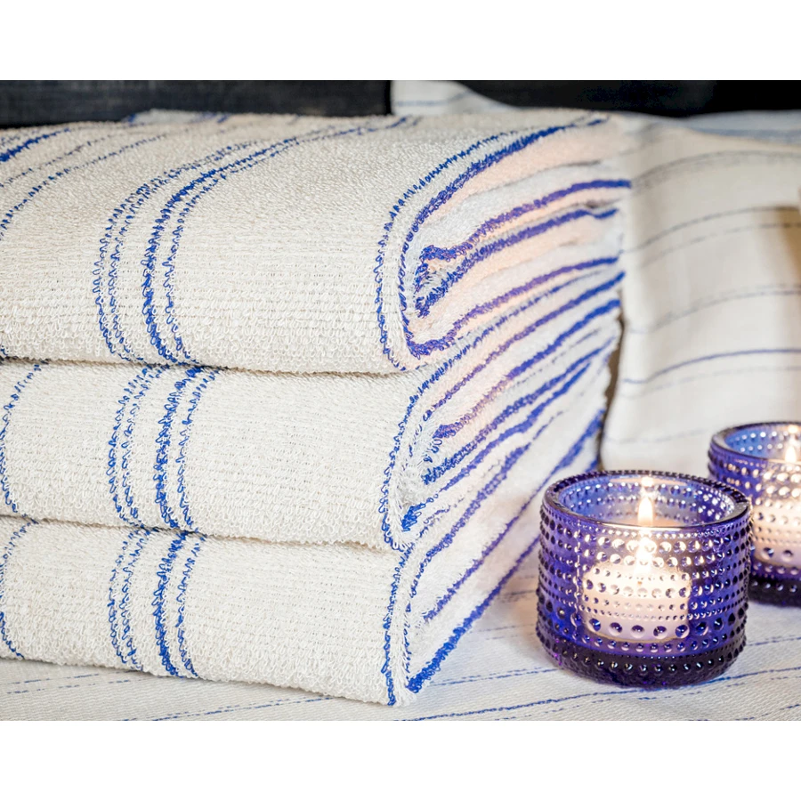 Ylellinen pellava-froteepyyhesetti Sataraita. Setissä kaksi raidallista käsipyyhettä sekä kaksi kylpypyyhettä. Pyyhkeet on valmistettu 70 % pellavasta ja 30 % puuvillasta. Korkealaatuinen raaka-aine ja tyylikäs sinivalkoinen kuviointi miellyttää ihoa sekä silmää. Suomi sataraita-sarjan on suunnitellut Raija Jokinen Suomen juhlavuoden kunniaksi. Samaan sarjaan saatavana myös laudeliina ja pefletit. Lahjapakkaus. Suosittelemme logomerkkausta merkkilapulla pyyhkeeseen. Pyydä tarjous.