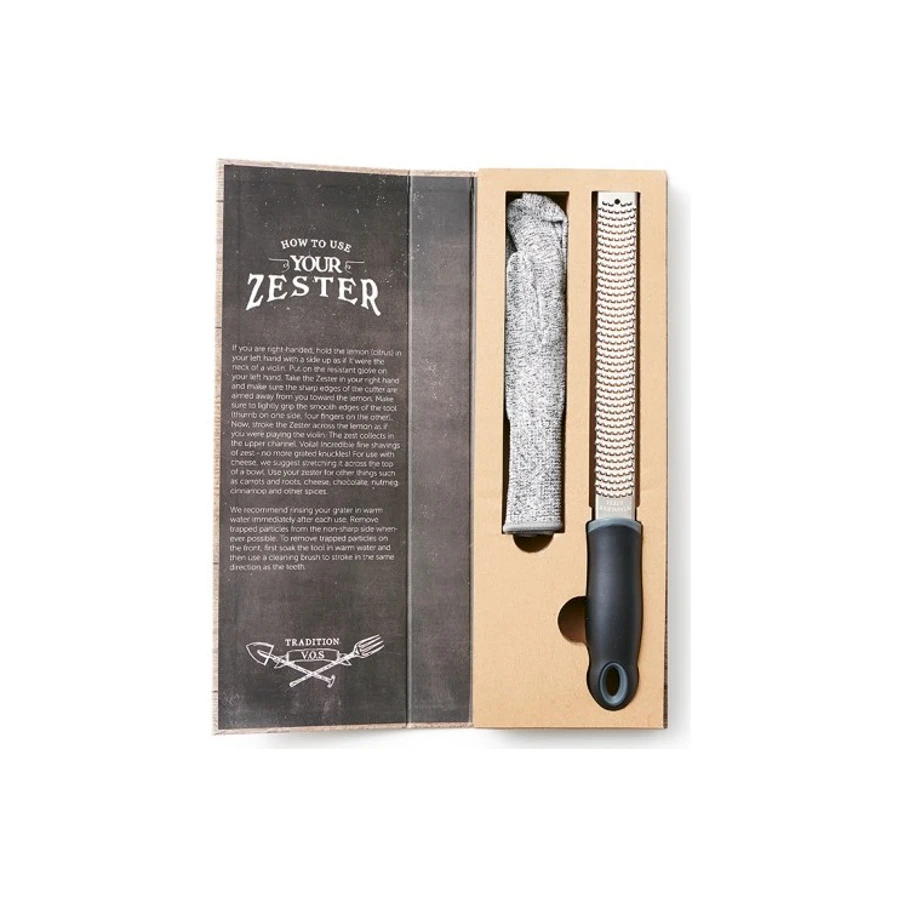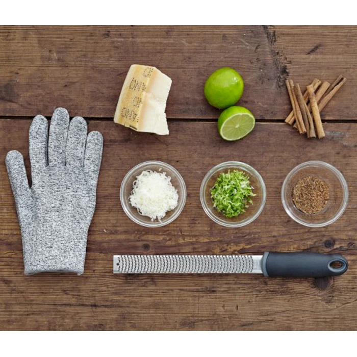 Tehokas raastinpuikko juuston, sitrusten, valkosipulin, inkiväärin ja vaikka suklaan raastamiseen. Mukana kokin käsiä suojaava hansikas. Koko 35,5x12x4 cm. Pakattu tyylikkääseen kirjalaatikkoon.
