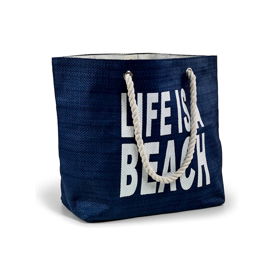 Vedenpitävä iso kassi punotuilla kantohihnoilla. Kevyt kassi sopii rannalle tai vaikkapa kauppakassiksi. Rantakassi logolla tuo brändisi aurinkoon! Käytännöllinen ja tyylikäs kesätuote tapahtumiin, asiakaslahjoiksi ja promootioihin. Väri: navy-valkoinen Koko: 59 x 35 cm