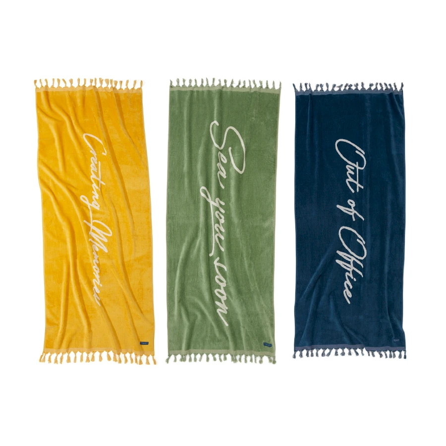 Rantapyyhe ekopuuvillaa. Suurikokoinen pehmeä rantakylpypyyhe on valmistettu 100% GOTS-sertifioidusta luomupuuvillasta ja se on käytännöllinen ja tyylikäs varuste nautinnollisille hetkille ulkona. Useita eri värejä eri aiheilla: Memories, See You Soon, Out of Office, Reserved, jne. Lahjapakkaus.