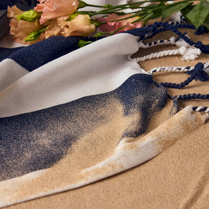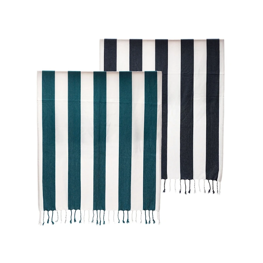 Rantapyyhe Hamam. Ihanan iso ja pehmeä Hamam rantapyyhe klassisella raitakuviolla. Pyyhe on valmistettu 70 % kierrätetystä puuvillasta ja 30 % polyesteristä. GRS-sertifioitu.