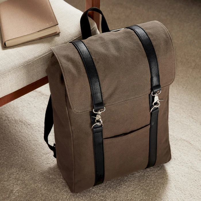 Puuvillakanvaasista valmistettu reppu, jonka hienot yksityiskohdat on tehty vegaanisesta nahasta. Tyylikäs sisävuori suojaa laukkua ja laukun sisältöä sekä antaa repulle ylellisen viimeistelyn. Sisällä on pehmustettu osasto kannettavalle tietokoneelle.