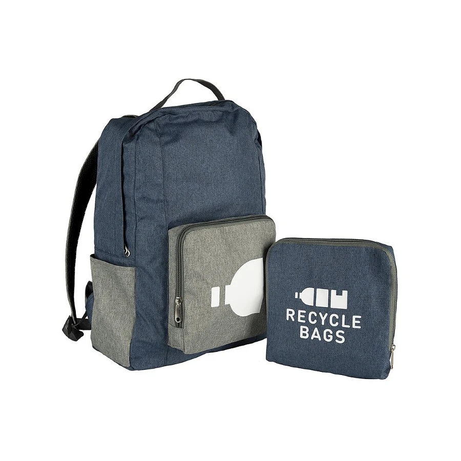 Kevyt kokoontaittuva reppu RPET-materiaalista. Käytännöllinen ja ekologinen reppu, jonka valmistukseen on käytetty 7 kierrätettyä juomapulloa. Reppu on taitettavissa edessä olevaan taskuun. Repun saa myös kinnitettyä matkatrolleyn kahvaan.