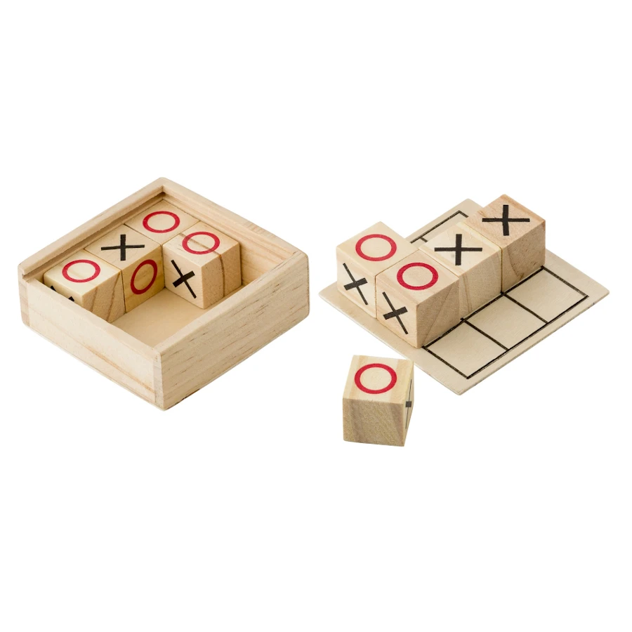 Puinen Ristinolla-peli. 9-osaiset pelinappulat säilyvät kätevästi puisessa kansilaatikossa.