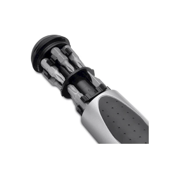 Käytännöllinen ja tehokas räikkäruuvitaltta, joka sisältää 12 kpl eri vaihtopäätä: 4 kpl ristipäätä, 4 talttapäätä ja 4 Torx-kantaa. Monipuolinen ja tilaa säästävä työkalusetti. Koko 35 x 35 x 172 mm. Lahjakotelo.