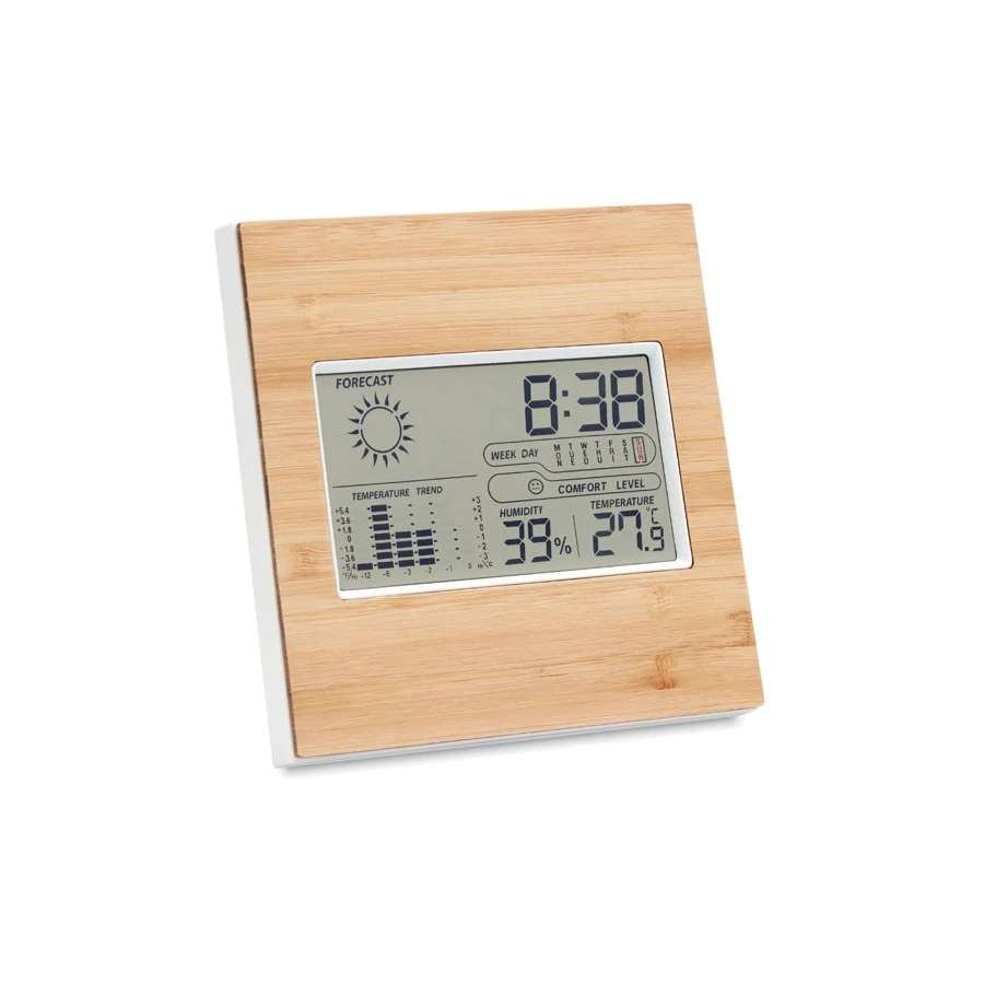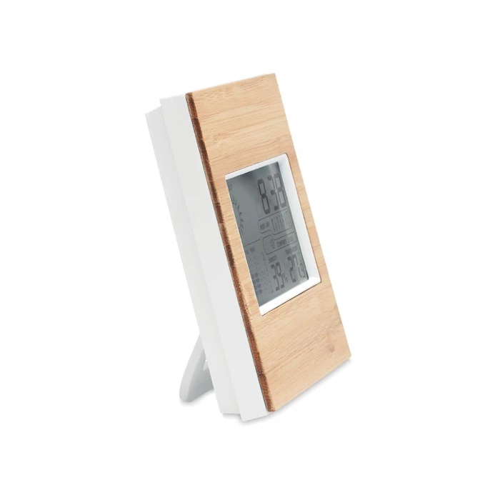Sääasema yritysten mainoslahjaksi kotiympäristöön. Monitoiminen sääasema, joka näyttää kellonajan, lämpötilan ja ilmankosteuden. Lisäksi siinä on kalenteri. Etuosa kaunista vaaleaa bambua. Toimii 2 AAA paristoilla. Paristot eivät sisälly pakettiin. Bambu on luonnon materiaali, joten tuotteiden väreissä ja koissa voi olla eroavaisuuksia.