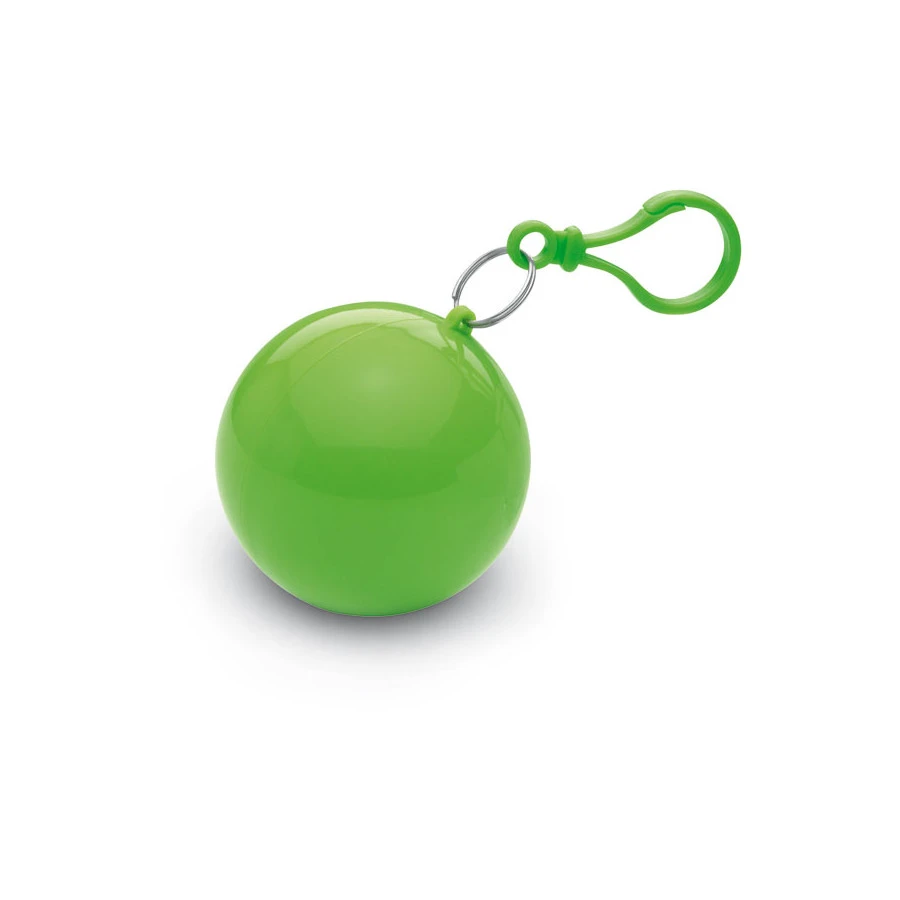 Kiinnityskoukulla varustettu, pallonmuotoinen kotelo, jossa on sisällä kertakäyttöinen sadeponcho. Koko noin ø 6 cm.