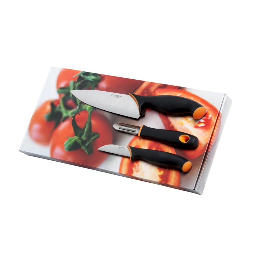 Lahjaksi Sadonkorjuusetti , joka sisältää juuresveitsen, perunankuorijan ja kokinveitsen. Kätevässä ja tyylikkäässä lahjapaketissa joka on helposti postitettava.