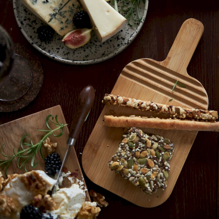 Bambusta valmistettu leikkuu-/tarjoilulauta. Leikkuulaudassa on harkittuja yksityiskohtia, kuten tukeva ja hyvin käteen istuva kädensija ja näyttävät ja käytännölliset urat tarjoiluvälineitä varten. Käsinpesu. Koko 27 x 13 cm.