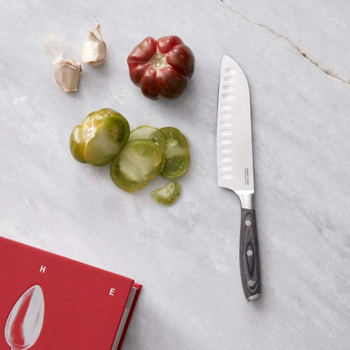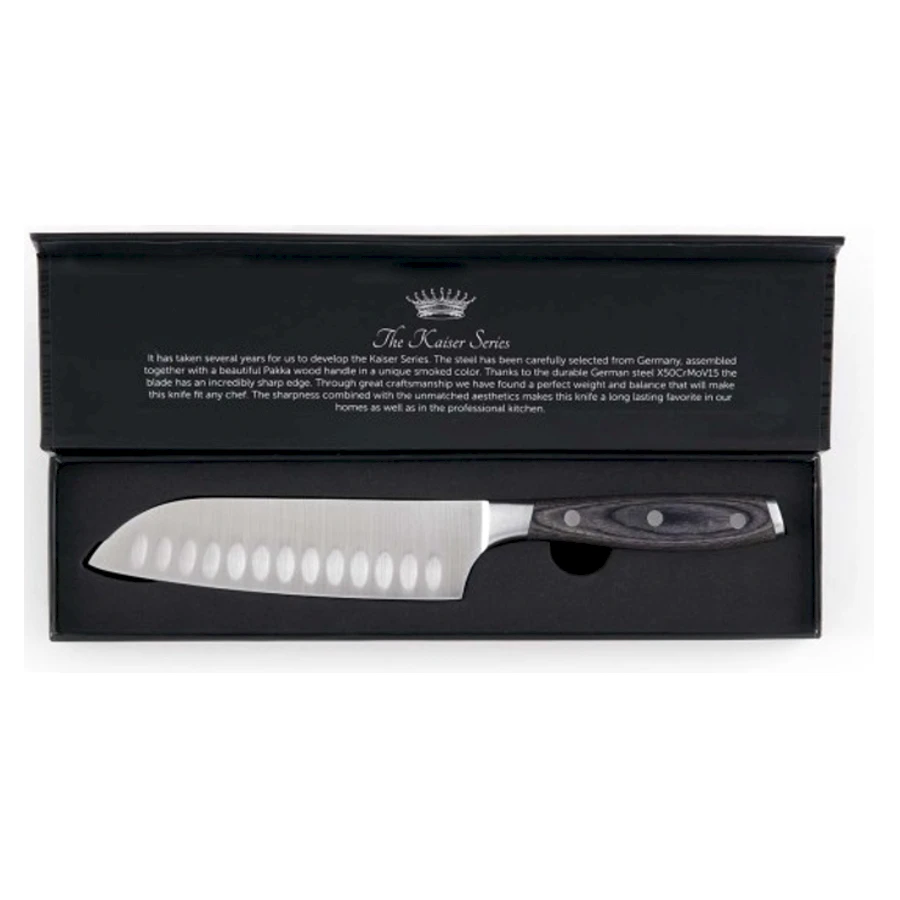 Santokuveitsi Kaiser. Santoku veitsi on japanilaismallinen kokkiveitsi joka sopii täydellisesti pilkkomiseen, hienontamiseen ja leikkaamiseen. Koko pituus 25,5 cm. Terä 14 cm Pakattu lahjalaatikkoon. Tuote on helposti postitettava.
