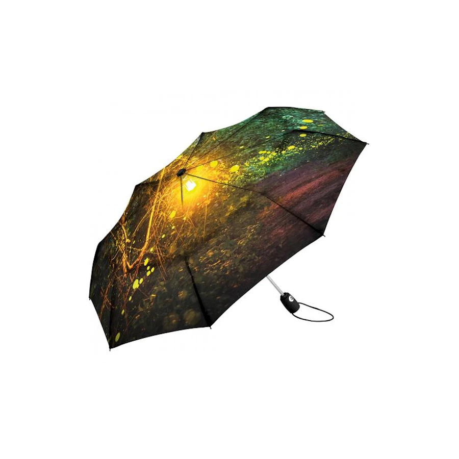 Sateenvarjo hehkuvalla painatuksella. Sateenvarjo on automaattisesti avautuva /sulkeutuva. Minisateenvarjossa on tukeva metallikehikko, joka kestää tuulta. Metallinen varsi ja soft-touch kahva. Yrityksesi mainospainatus voidaan toteuttaa sateenvrjoon hehkuvin värein jotka hohtavat pimeässä kun valo osuu sateenvarjoon. Räiskyvän hehkuva sateenvarjo on mainio suoja pimeässä. Pyydä tarjous omasta toteutuksesta.