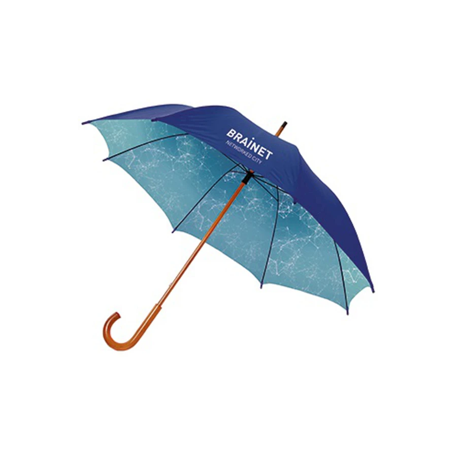 Sateenvarjo rPET 23" puukahvalla ja puisella rungolla. Varjo-osa on tehty kierrätetyistä juomapulloista rPET-materiaalista. Sateenvarjo voidaan painaa sublimaatiopainatuksella valokuvamaisesti. Varjon halkaisija 102 cm. Pituus suljettuna 89 cm. Varjossa on 8 paneelia.