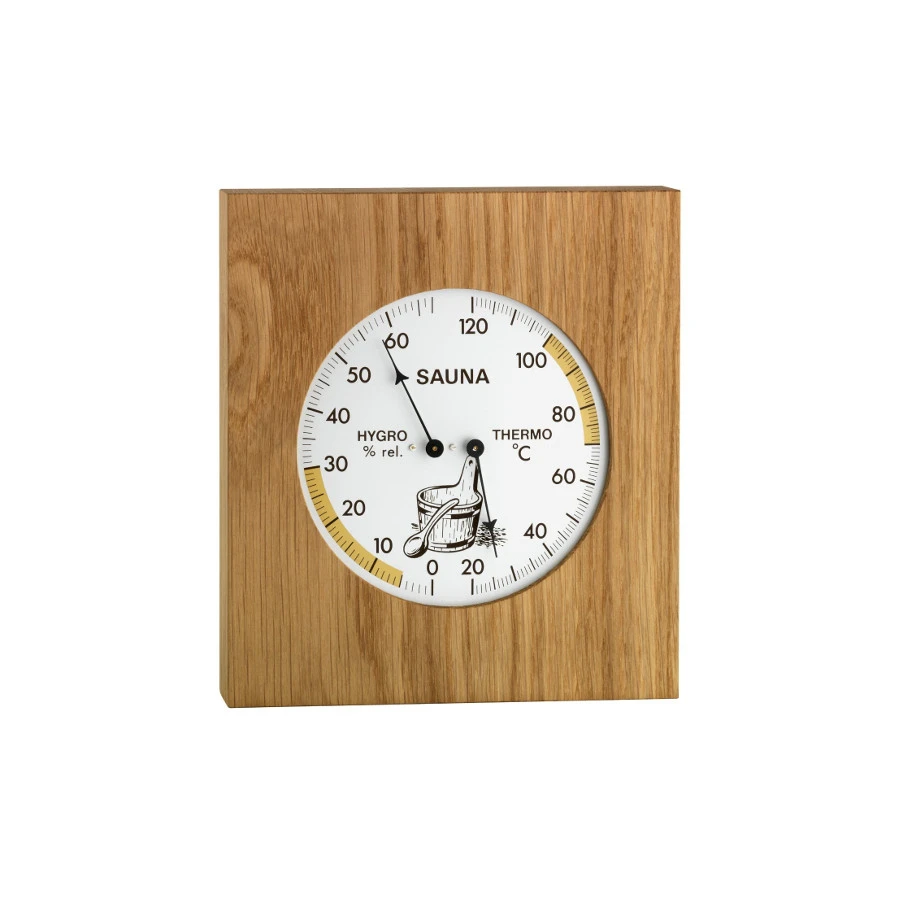 Puinen saunamittari. Tammesta valmistetussa mittarisa on selkeä asteikko ja se ilmoittaa tarkasti saunan kosteuden ja löylynlämmön. Öljyttyä tammea. Koko 180 x 45 x 200 mm.