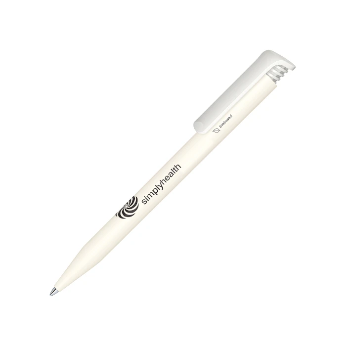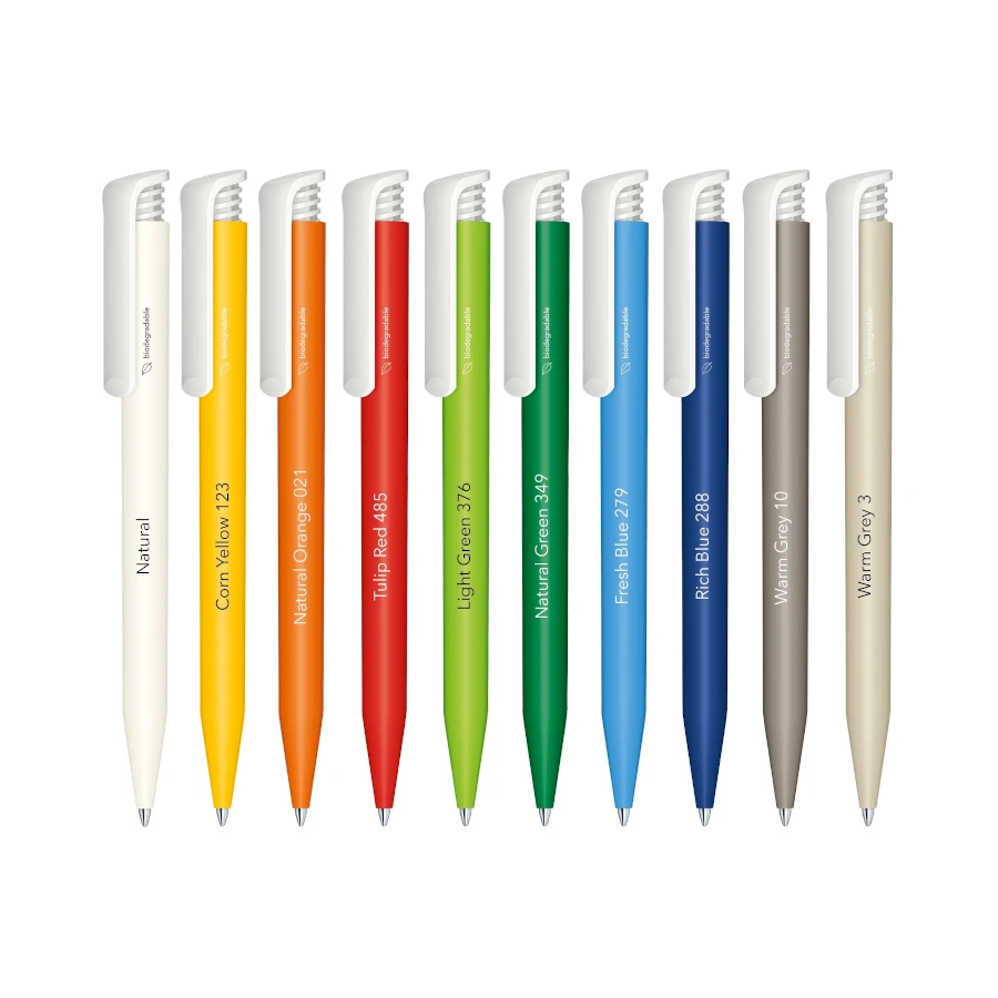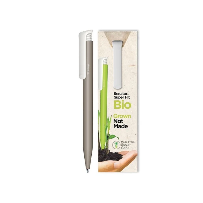 Senator Super Hit Bio kuulakärkikynä. Mattapintainen edullinen mainoskynä valkoisella kiiltävällä klipsillä. Klipsissä painomekanismi. Kynä on valmistettu Biohajoavasta materiaalista. Kynässä laadukas Senator® magic flow X20 säiliö. (1.0 mm). Voit valita mustan tai sinisen kirjoitusmusteen. Saatavana useissa upeissa mattaväreissä mainospainatuksella.