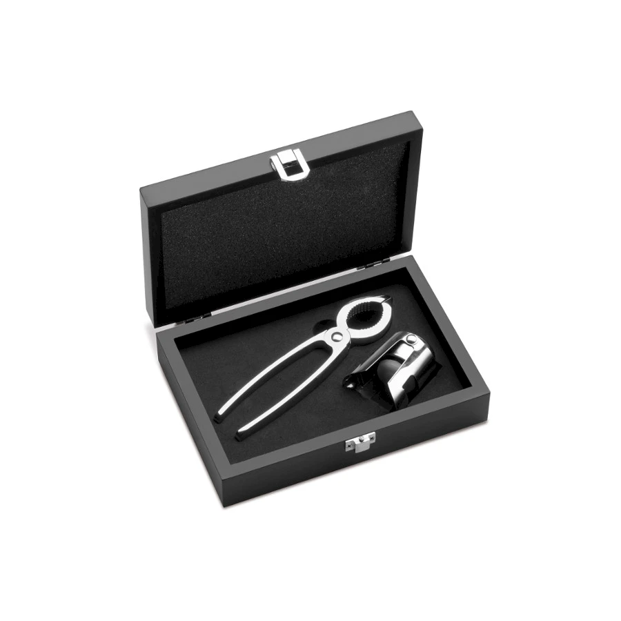 Shampanjasetti mustassa lahjakotelossa. Lahjakotelossa metallinen avaaja ja suljettava korkki. Koko 203 x 150 x 63 mm.