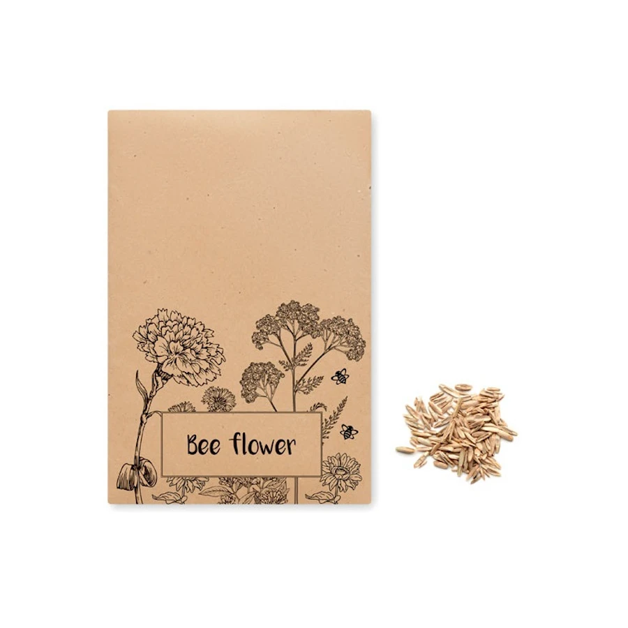 Siemenpussi kierrätyspaperista. Pussi sisältää sekoituksen siemeniä, joista kasvaa mehiläisille mieluisia kukkia. Valmistettu EU:ssa. Siemenpussiin on mahdollista saada logopainatus.