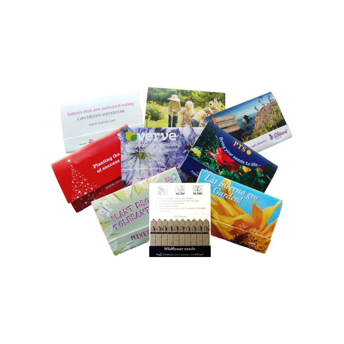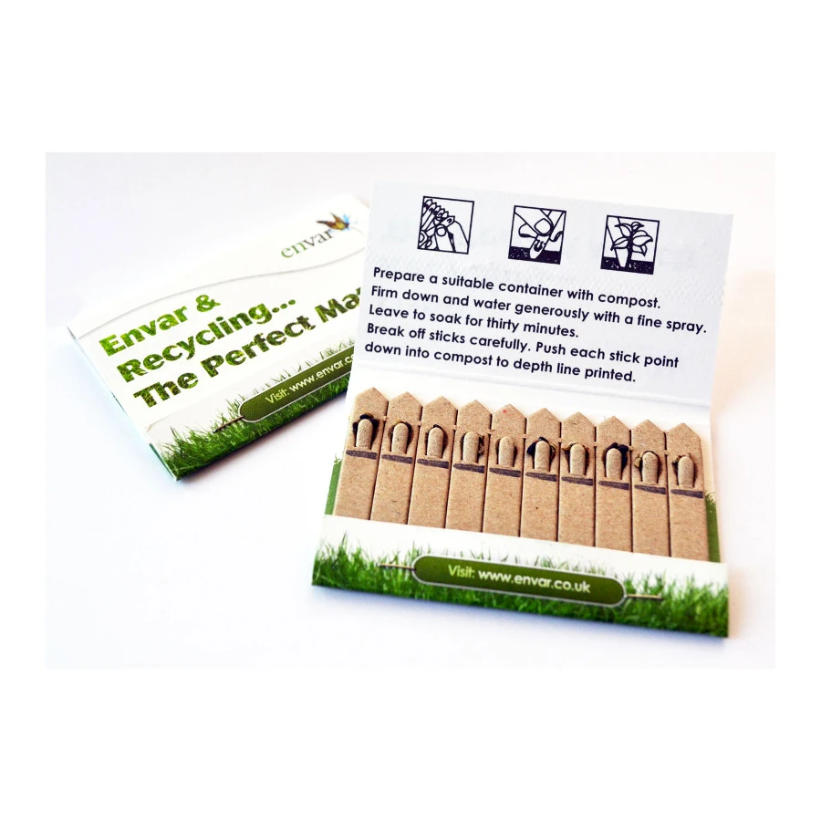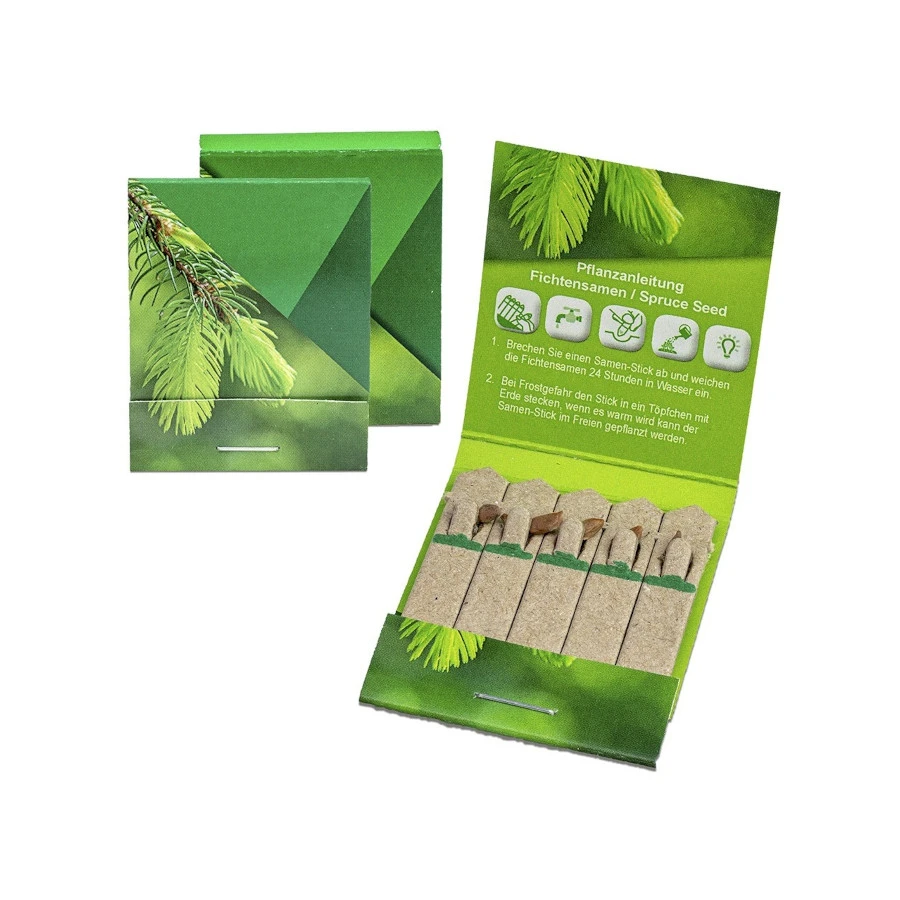 Siemenpakkaus omalla mainospainatuksella. Pakkauksen sisällä ekolooginen tikku jonka päässä valitsemasi siemen. Tikun voi istuttaa suoraan multaan. Käyttöohjeet sisäpuolella. Laajasta siemenvalikoimasta voit valita haluamasi siemenen. Pyydä tarjous omasta määrästä ja toteutuksesta.