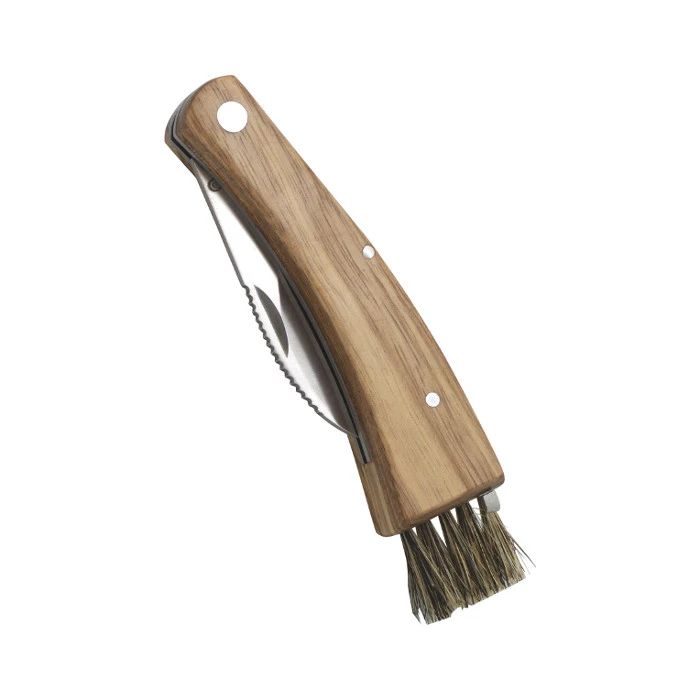 Sieniveitsi harjalla. Kaarevan muotoinen taittuva sieniveitsi on terävä ja mukava käteen. Kapean muotonsa vuoksi sillä on helppo leikata ja putsata sienet. Tumma puukahva. Mukana pinsetit, jolla voit puhdistaa harjasosan piikeistä. Pakattu mustaan nailon pussiin. Terän pituus 7 cm.