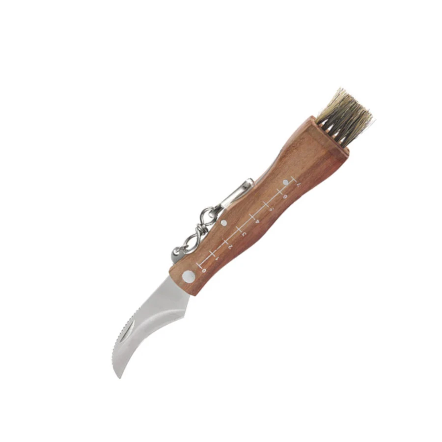 Sieniveitsi ripustuslenkillä ja sieniharjalla. Käytännöllinen taitettava veitsi, jossa mitta-asteikollinen puukahva. Täydellinen veitsi sienestäjälle. Voidaan yhdistää muiden tuotteidemme kanssa lahjasetiksi.