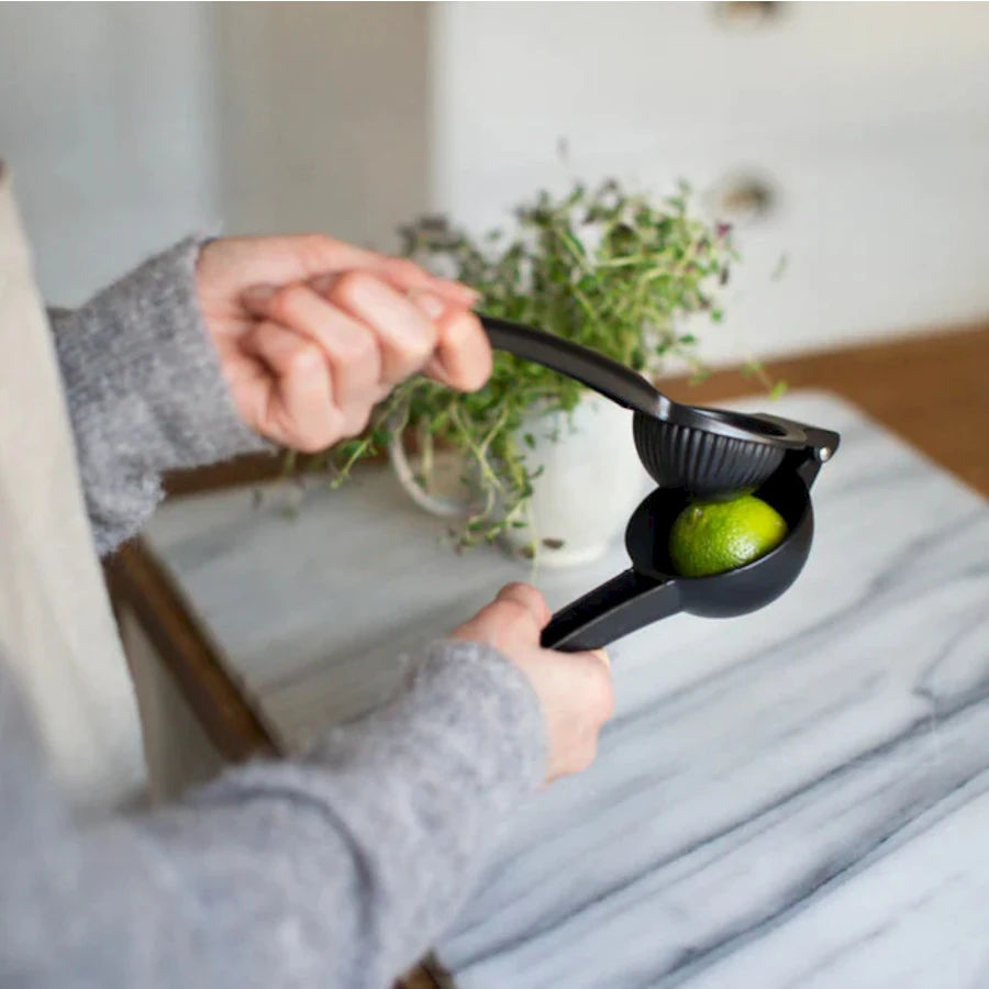 Sitruspuristin Juice Press. Käytännöllinen sitruspuserrin jolla puserrat limen, sitruunat ja appelsiinit helposti terveelliseksi mehuksi suoraan lasiin. Todella kätevää. Voit pestä sitruspuristimen astianpesukoneessa käytön jälkeen. Saatavana kaksi eri kokoa.