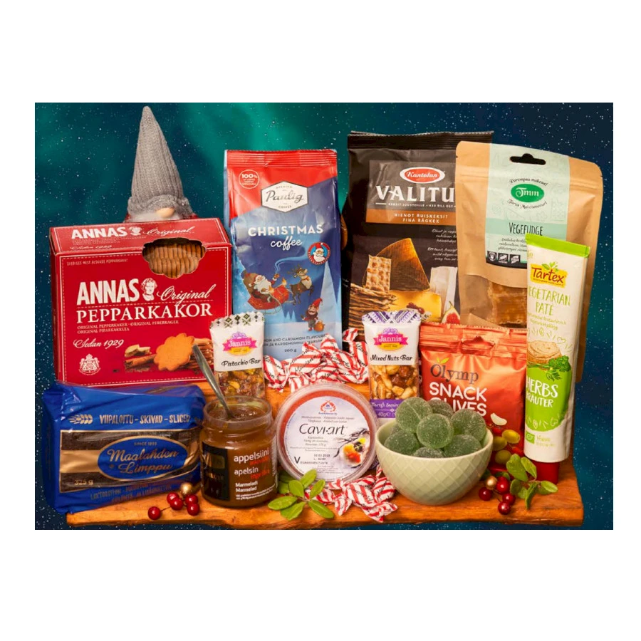 Special Edition vegaaninen lahjasetti on loistava joululahja asiakkaille ja henkilökunnalle. Ihastuttava lahjasetti pitää sisällään: Tartex kasvistahna yrtti 200 g, Cavi art merilevävalmiste punainen 170 g, Fazer vihreät kuulia 260 g, Marianne 200 g, Fazer Vege Fudge 200 g, Turun Makeismestari Maalahdenlimppu viipaloitu 325 g, Annan original piparkakku 300 g, Kantolan Valitut ruiskeksi 100 g, Pistaasipähkinälevy 40 g, Jannis Pistaasisekoituslevy 40 g, Jannis, Chilimarinoitu vihreä oliivi 70 g, Olymp, Christmas coffee 200 g, Paulig, Appelsiini-inkiväärimarmeladi 240 g, Filos, Laatikko